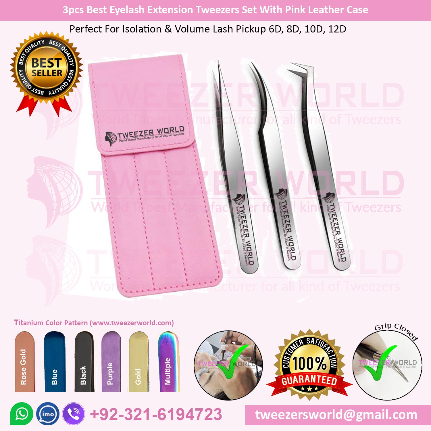 Products Name: 3pcs Best Eyelash Extension Tweezers Set With Pink Leather Case 3pcs Best Eyelash Extension Tweezers Set With Pink Leather Case is made of lightweight stainless steel. Use them to pick up a single lash extension and dip it into the eyelash adhesive. This tool is easy to hold and control, so you’ll be confident as you work on your client’s lashes. For professional use only. Tweezer World Company Manufacturer of all types of tweezers is made of superior quality stainless steel J1/410, HRC° (hardness) 43° – 45°. Beautifully designed top-quality stainless steel straight tweezers. Perfect For Volume Lash Pickup 6D, 8D, 10D, 12D, 15D