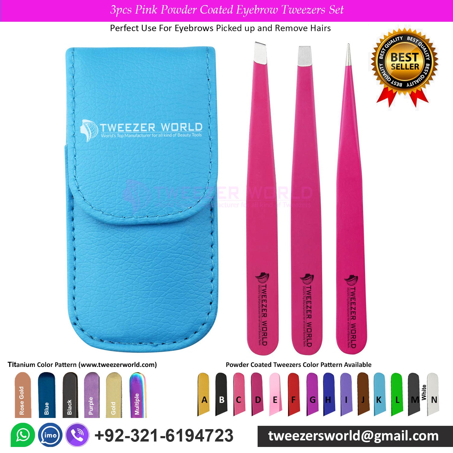 Eyebrow Tweezers manufacturing Details 1. Product name: 3pcs Pink Powder Coated Eyebrow Tweezers Set