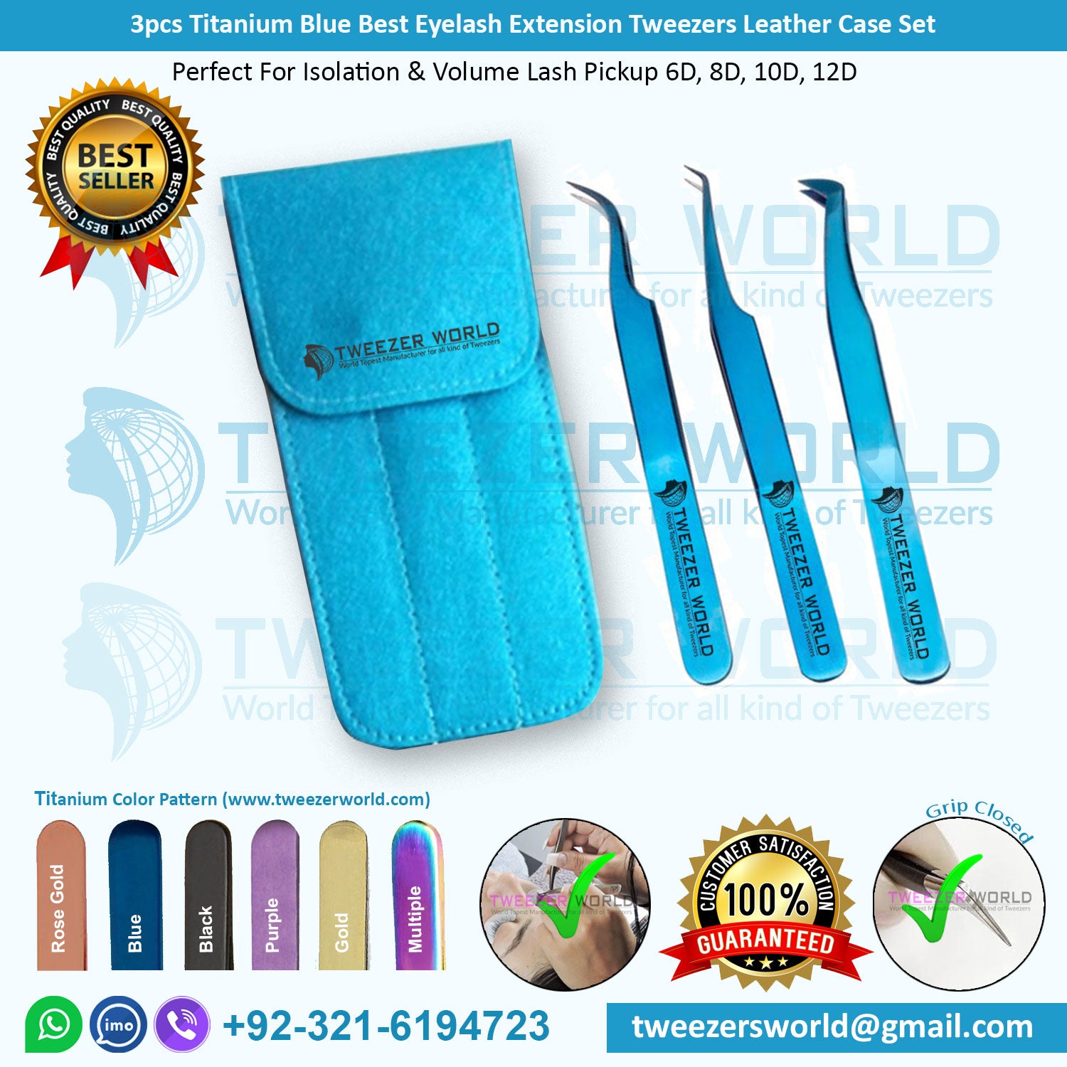 Products Name: 3pcs Titanium Blue Best Eyelash Extension Tweezers Leather Case Set 3pcs Titanium Blue Best Eyelash Extension Tweezers Leather Case Set is made of lightweight stainless steel. Use them to pick up a single lash extension and dip it into the eyelash adhesive. This tool is easy to hold and control, so you’ll be confident as you work on your client’s lashes. For professional use only. Tweezer World Company Manufacturer of all types of tweezers is made of superior quality stainless steel J1/410, HRC° (hardness) 43° – 45°. Beautifully designed top-quality stainless steel straight tweezers. Perfect For Volume Lash Pickup 6D, 8D, 10D, 12D, 15D