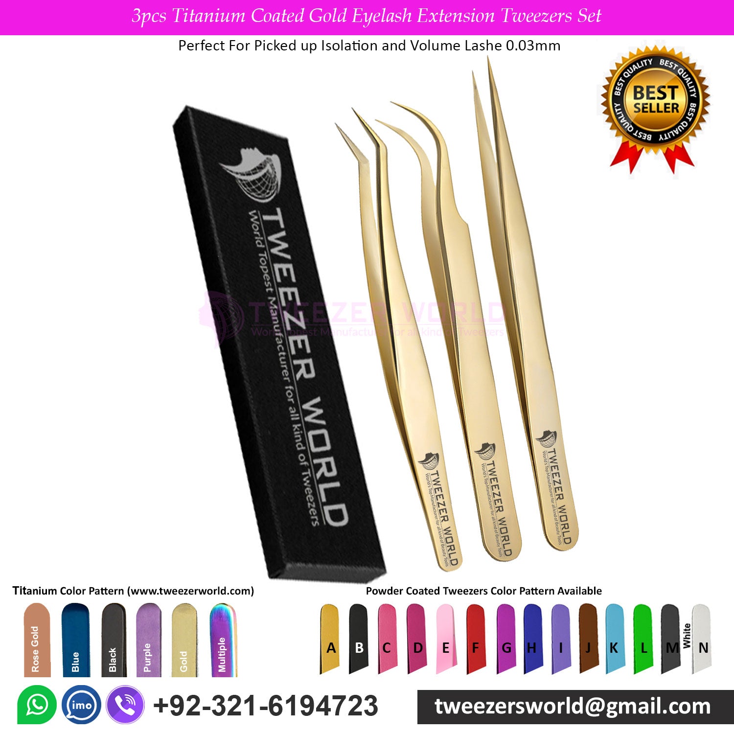 3pcs Titanium Coated Gold Eyelash Extension Tweezers Set