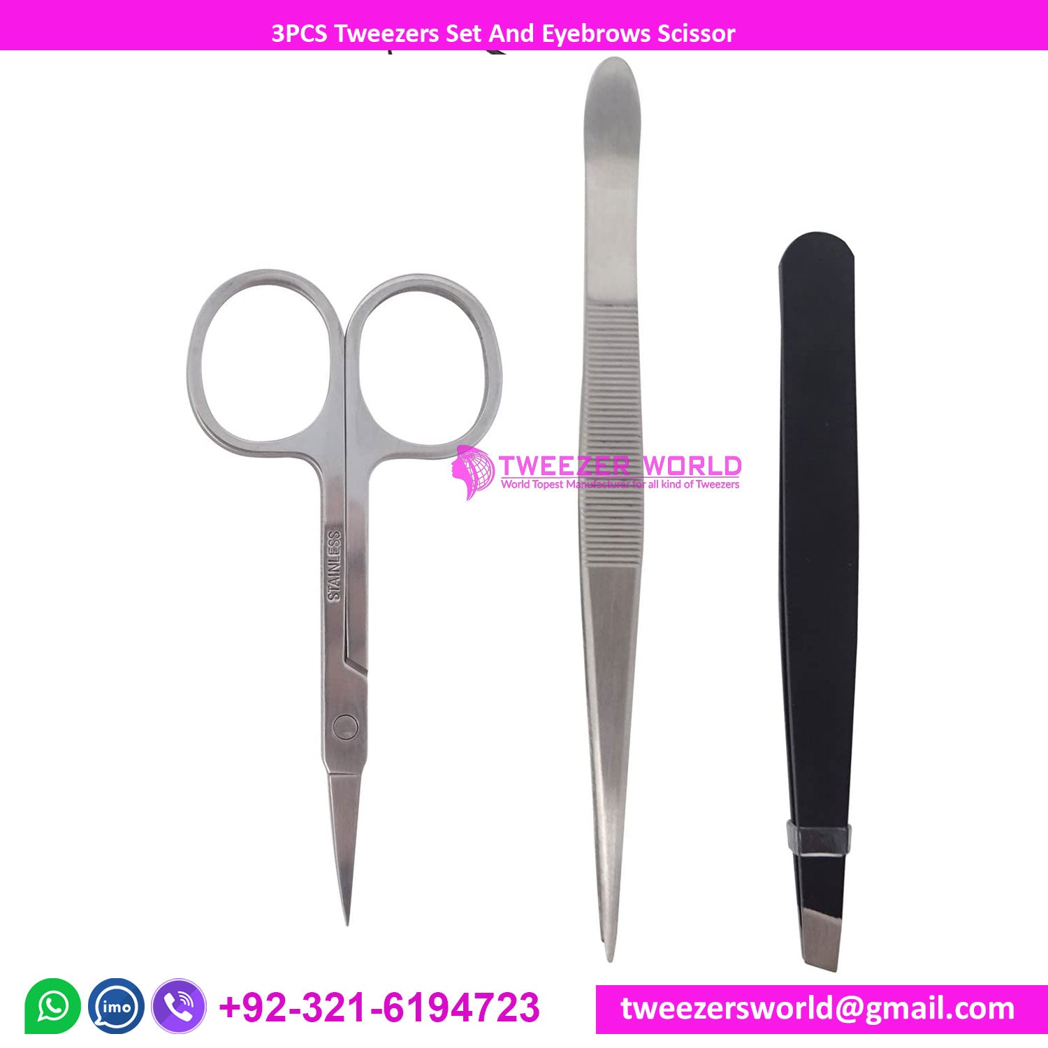 1. Product name: 3PCS Tweezers Set Point and Slant Stainless Steel Tweezers and scissor