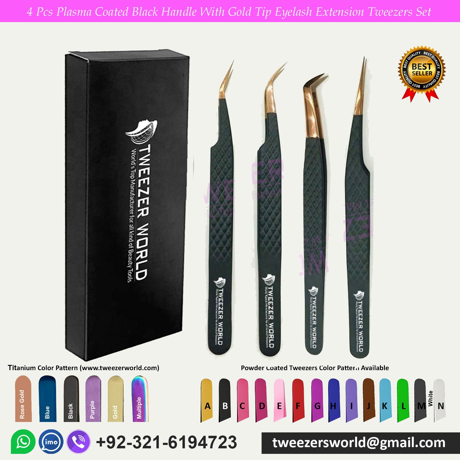 Product Name: 4 Pcs Powder Coated Black Handle With Gold Tip Eyelash Extension Tweezers Set Description: Classic Matt or Satin Finish Perfect For Isolation, 0.03mm Volume Pickup 6D, 8D, 10D, 12D, 15D, 20D Self Closing, 90 Degree Fiber Tip Tweezers Purple Manufacture By Tweezer World Tweezer World Company Manufacturer of all types of tweezers is made of superior quality surgical grade stainless steel J1/410, HRC° (hardness) 43° – 45°. Beautifully designed top-quality stainless steel straight tweezers.