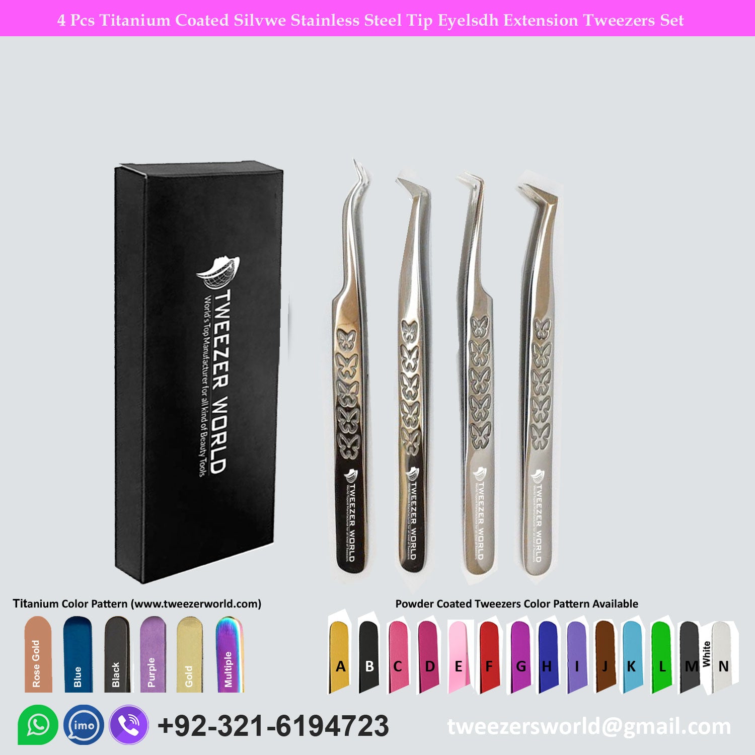 Product Name: 4 Pcs Titanium Coated Silver Stainless Steel Tip Eyelash Extension Tweezers Set Description: Classic Matt or Satin Finish Perfect For Isolation, 0.03mm Volume Pickup 6D, 8D, 10D, 12D, 15D, 20D Self Closing, 90 Degree Fiber Tip Tweezers Purple Manufacture By Tweezer World Tweezer World Company Manufacturer of all types of tweezers is made of superior quality surgical grade stainless steel J1/410, HRC° (hardness) 43° – 45°. Beautifully designed top-quality stainless steel straight tweezers.