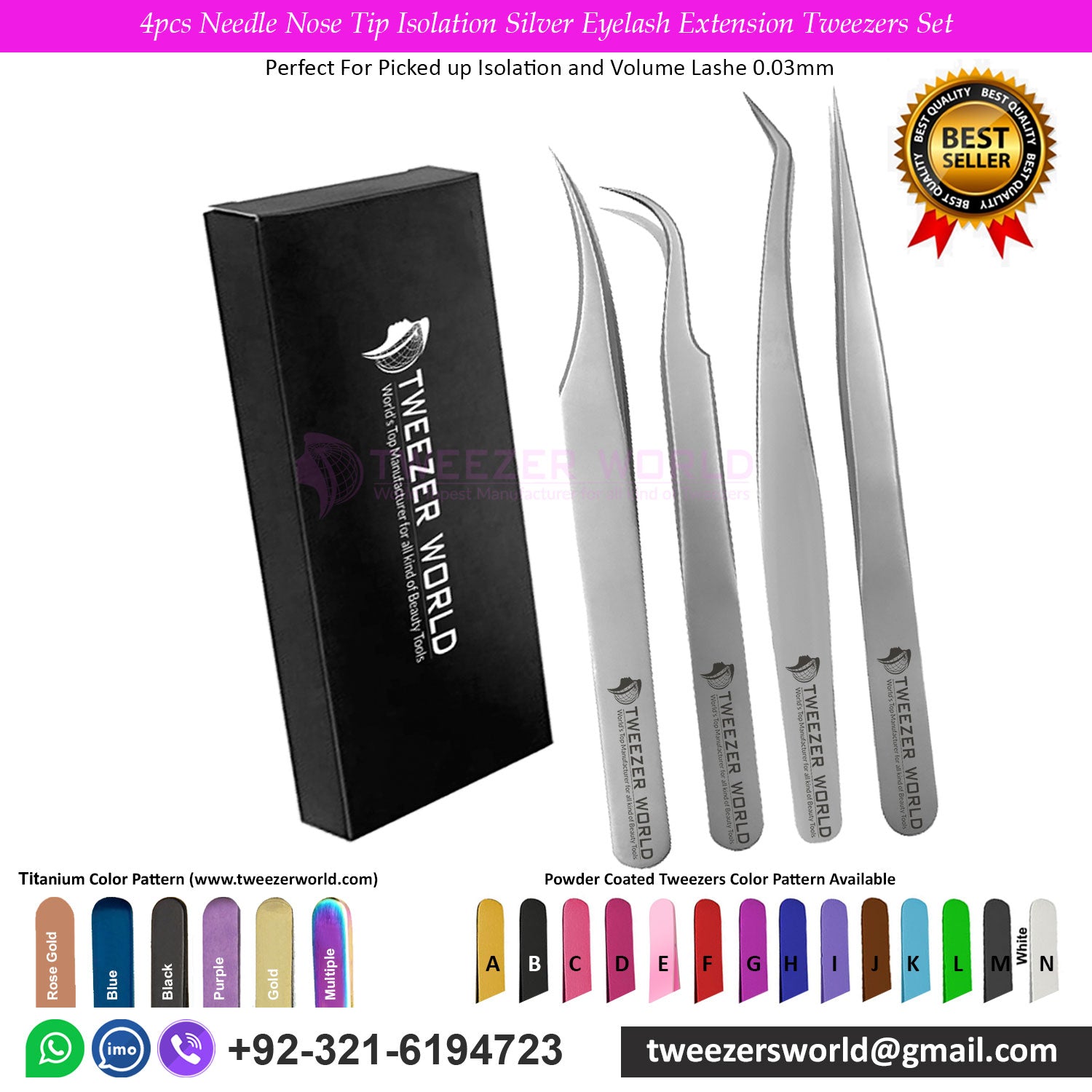 4pcs Needle Nose Tip Isolation Silver lash Extension Tweezers Set