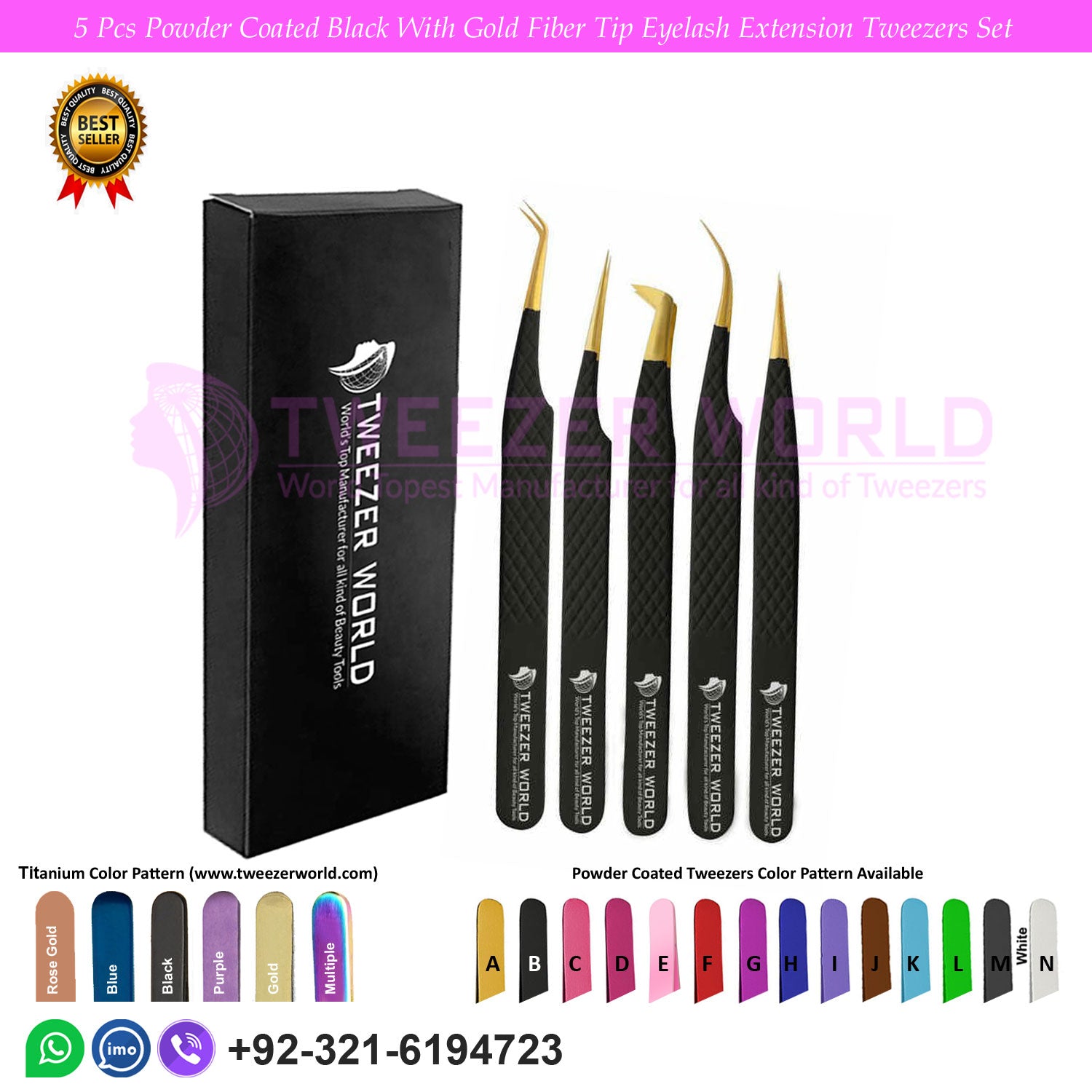 5 Pcs Powder Coated Black With Gold Fiber Tip Eyelash Extension Tweezers Set
