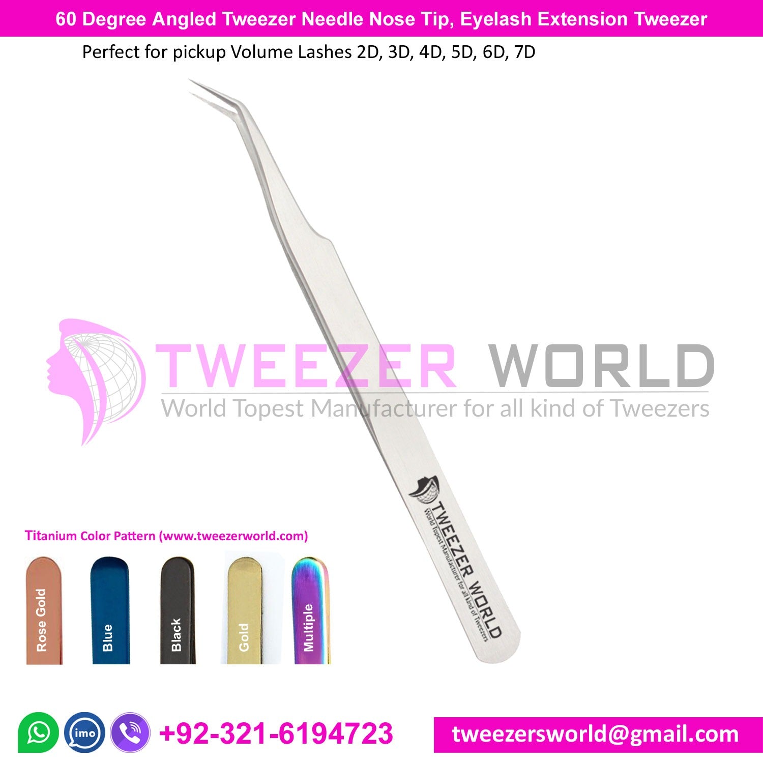 60 Degree Angled Tweezer Needle Nose Tip, Eyelash Extension Tweezer 60 Degree Angled Tweezer Needle Nose Tip, Eyelash Extension Tweezer is made from premium quality stainless steel. Our volume tweezers are available in many different styles that all feature a high surface area at the foot of the tweezers. This makes them ideal for volume lashing.