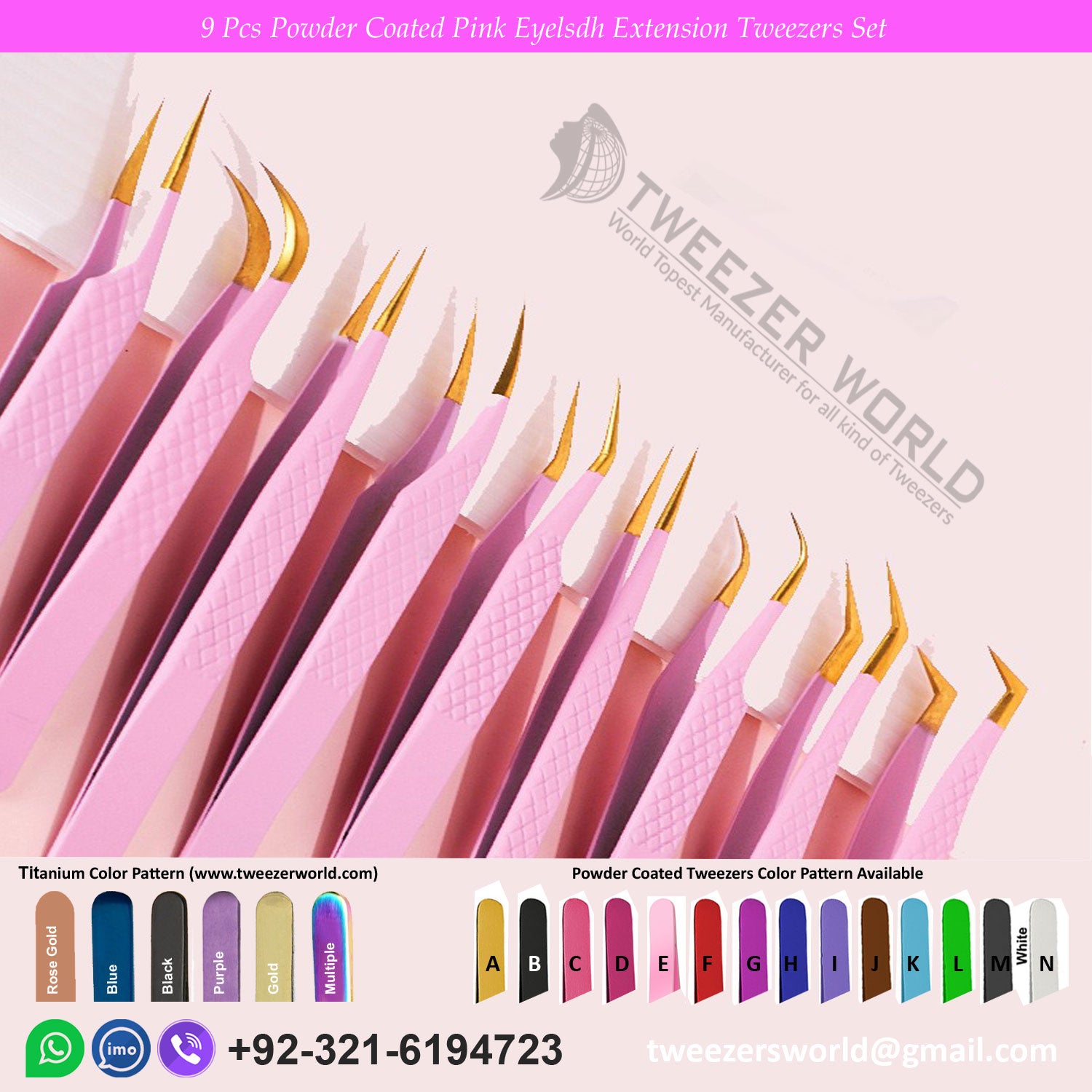9 Pcs Powder Coated Pink With Gold Fiber Tip Eyelash Extension Tweezers Set for Professionals Description: Classic...