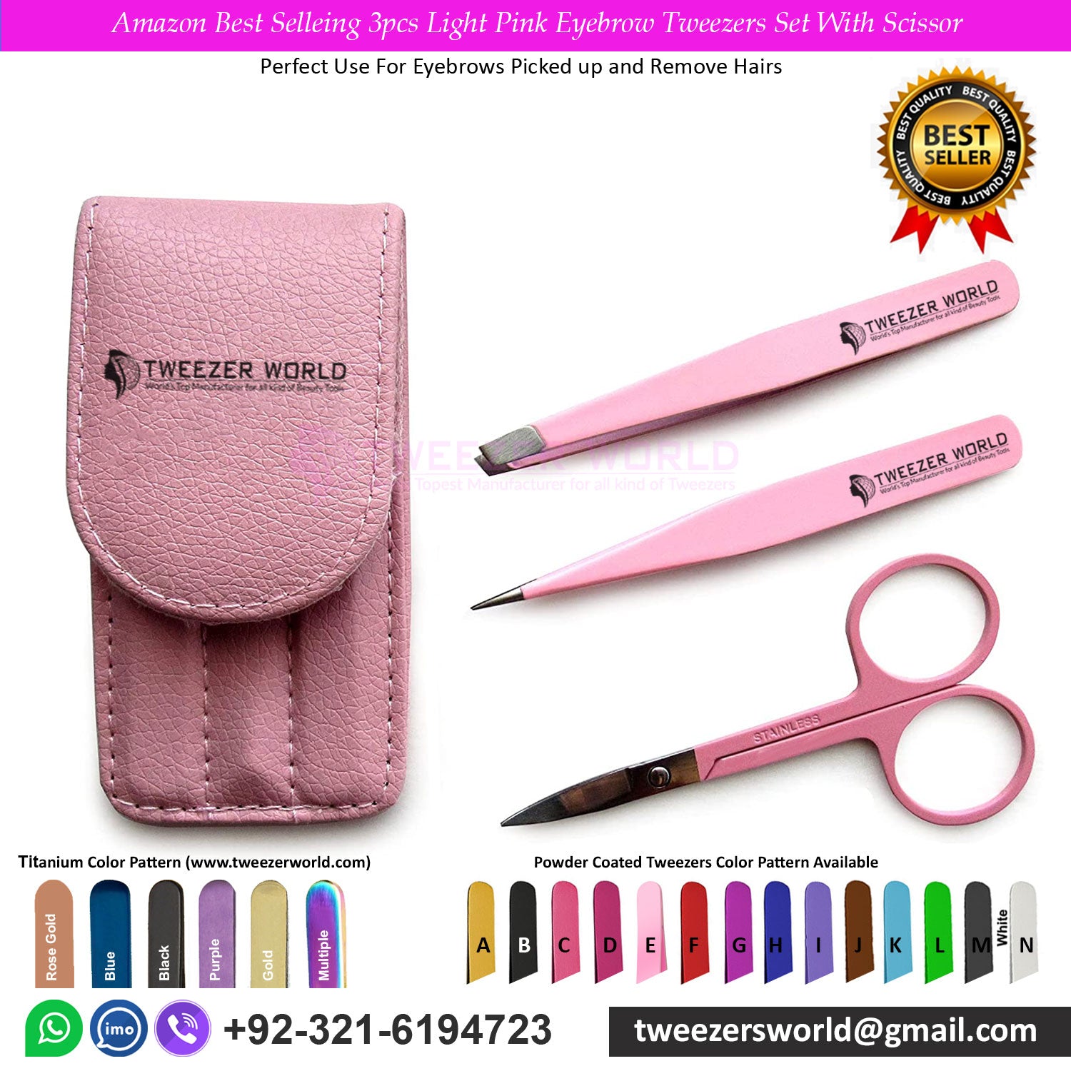 Amazon Best Selling 3pcs Light Pink Eyebrow Tweezers Set With Scissor[/caption]