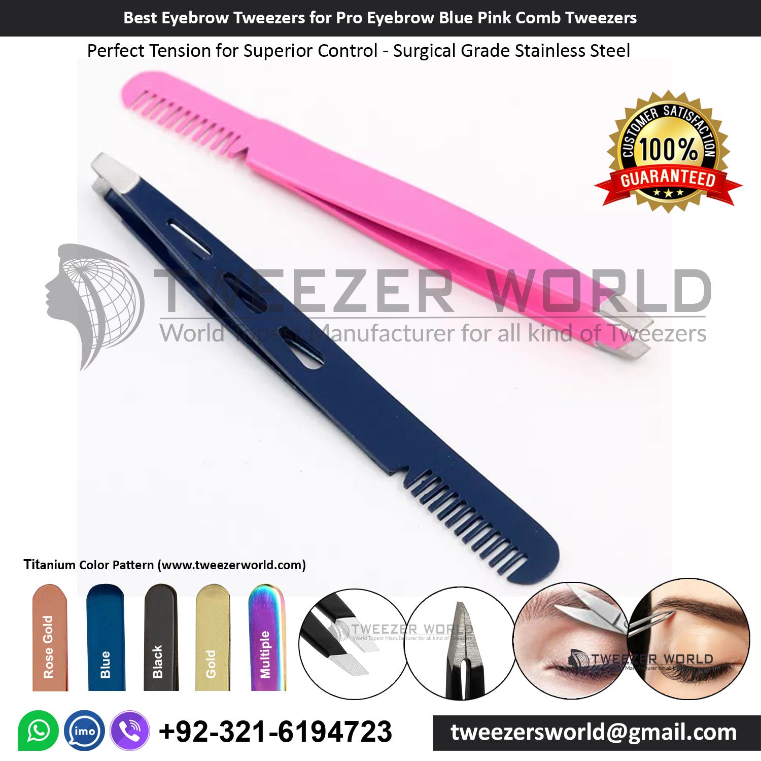 Products Name: Best Eyebrow Tweezers for Pro Eyebrow Blue Pink Comb Tweezers Best Eyebrow Tweezers for Pro Eyebrow Blue Pink Comb Tweezers are made of lightweight stainless steel. Use them to pick up an eyebrow removal and dip it into the eyelash adhesive. This set is easy to hold and control, so you’ll be confident as you work on your client’s eyebrows. For professional use only. Tweezer World Company Manufacturer of all types of tweezers is made of superior quality stainless steel J1/410, HRC° (hardness) 43° – 45°. Beautifully designed top-quality Best Eyebrow Tweezers 2pcs set for Eyebrow Professional Precision Tweezers.