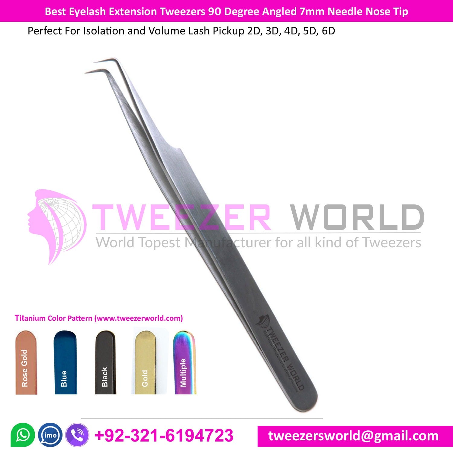 Product Features Best Eyelash Extension Tweezers 90 Degree Angled 7mm Needle Nose Tip are made of HIGH-GRADE surgical stainless steel Used to Pick Up and Apply for Lash Extensions Very well built, both ends close very well without any gap, rust-free. Designed to reduce hand fatigue. When in use, comfortable hand feeling, can adapt to long-term work. The appearance of smooth lines, fine processing. Lightweight so does not cause hand fatigue Wholesale and Retail eyelash extension tweezers. TWEEZER WORLD and light volume tweezers also available in our shop