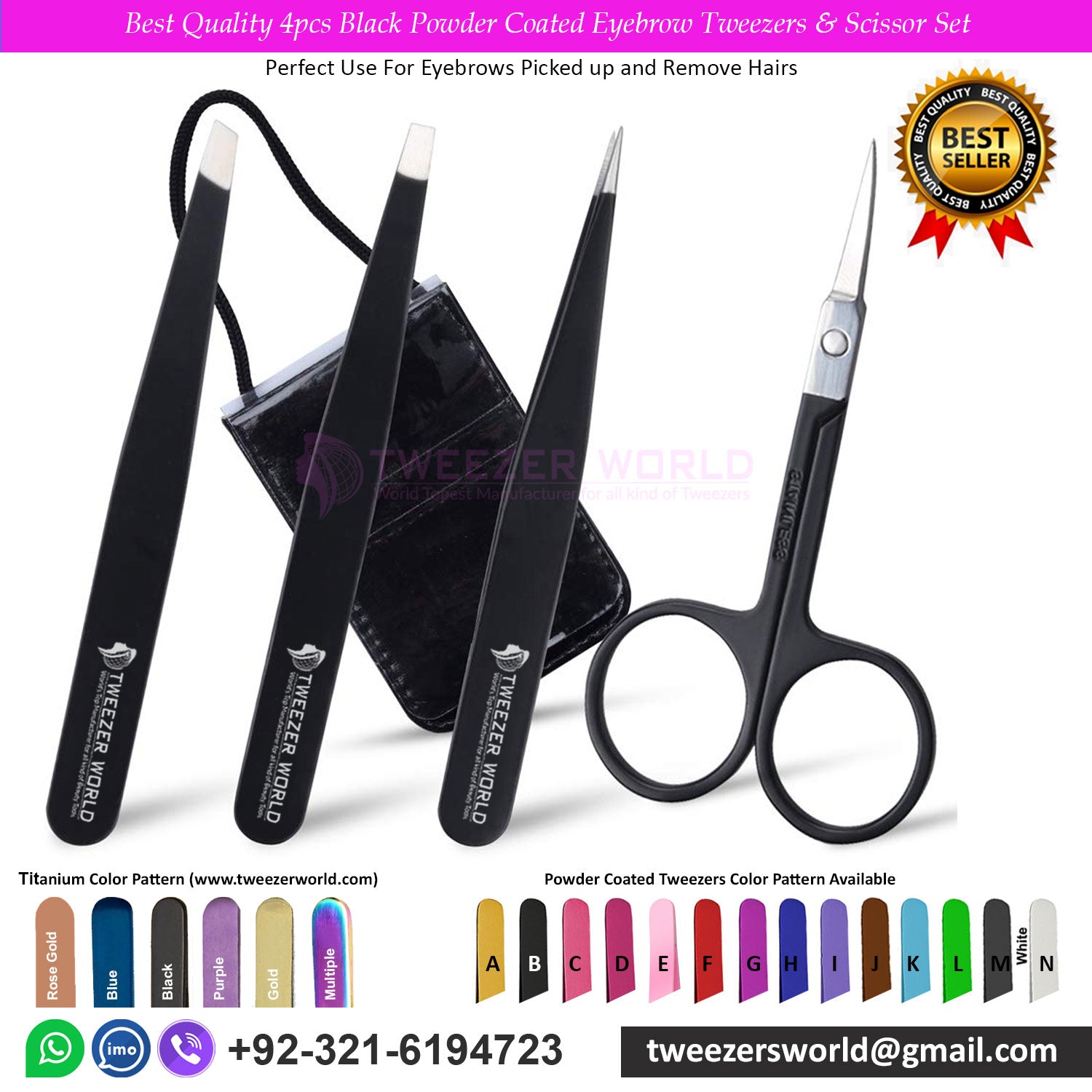 Best Quality 4pcs Black Powder Coated Eyebrow Tweezers & Scissor Set