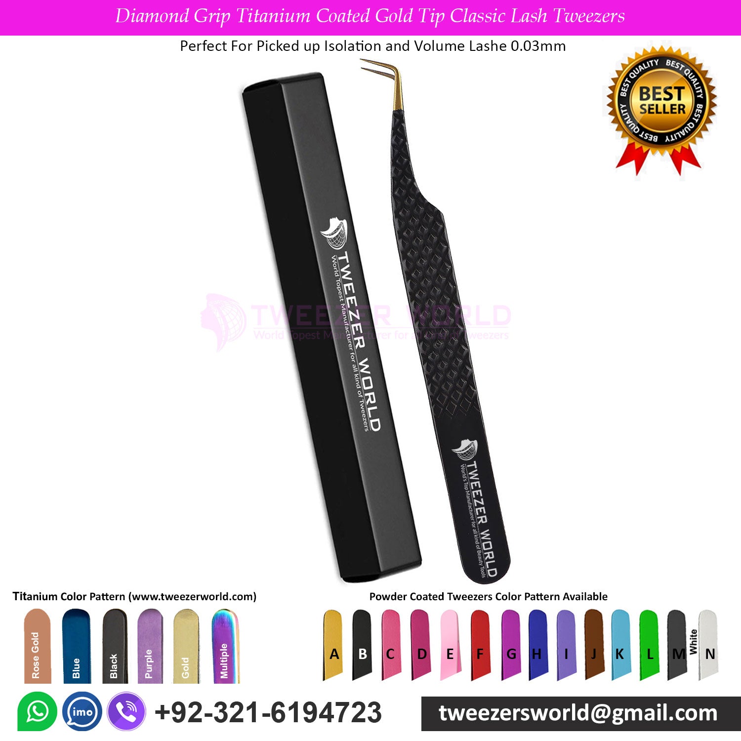 1. Product name: Diamond Grip Titanium Coated Gold Tip Classic Lash Tweezers
