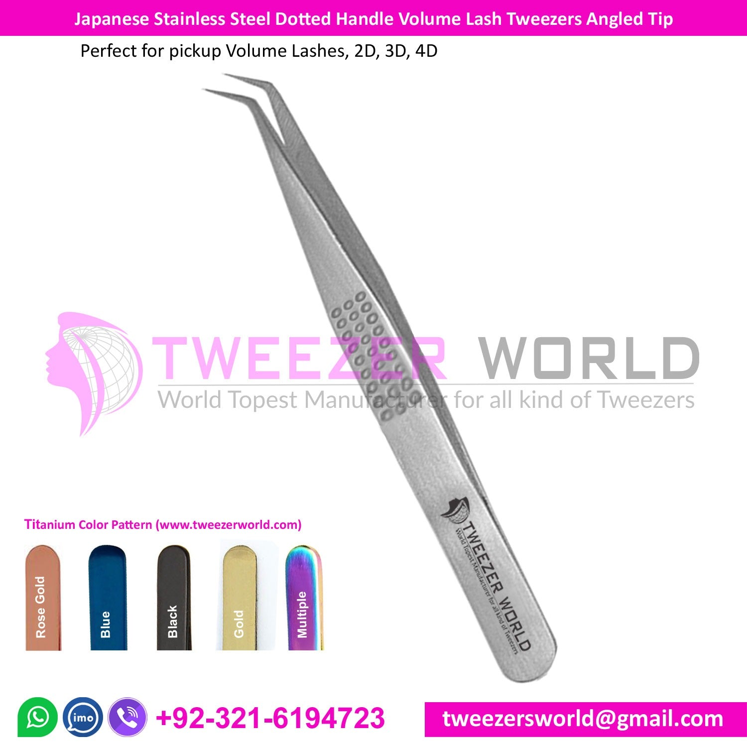 1. Product name: Japanese Stainless Steel Dotted Handle Volume Lash Tweezers Angled Tip Soft Grip L-Type Perfect for pickup Volume Lashes 2D-3D-4D-5D-6D-7D