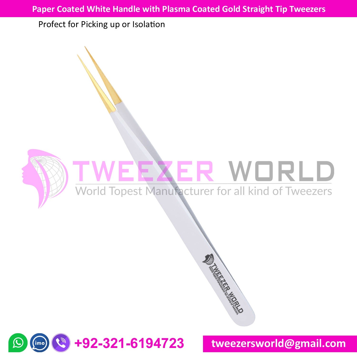 Product Name: Paper Coated White Handle with Plasma Coated Gold Straight Tip Tweezers Description: Matt Finish Handle...