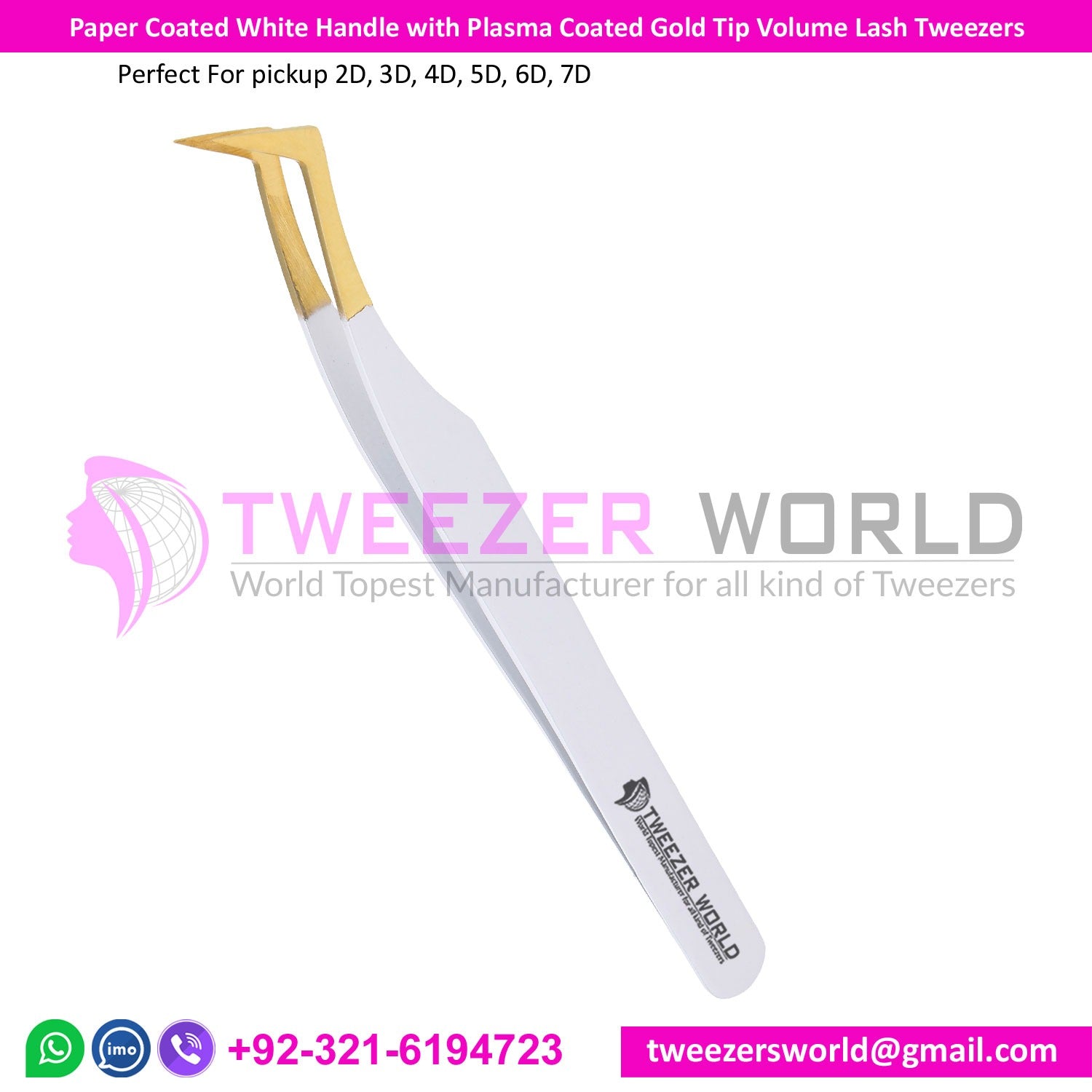 Product Name: Paper Coated White Handle with Plasma Coated Gold Tip Volume Lash Tweezers