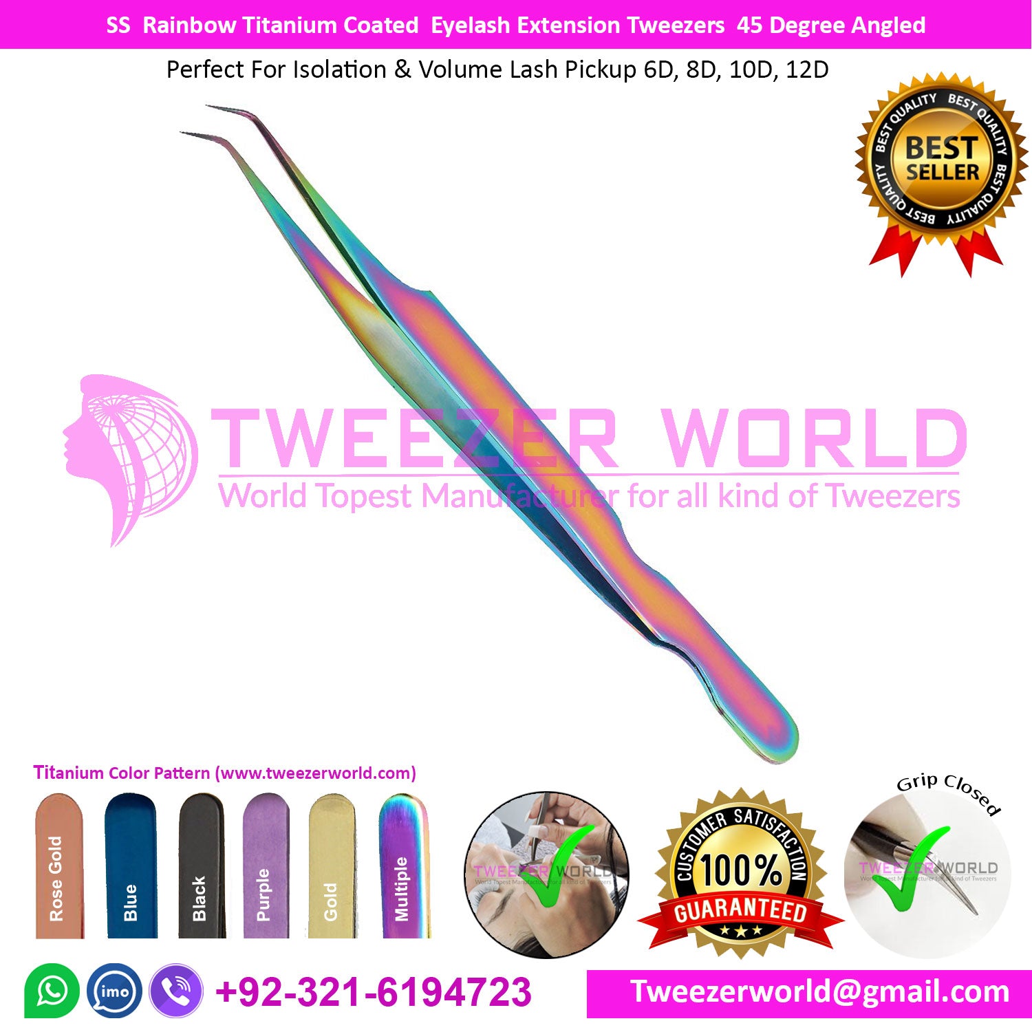 All of TWEEZER WORLDSS SS Rainbow Titanium Coated Eyelash Extension Tweezers 45 Degree Angled have been hand crafted to ensure high quality design, precise alignment, and comfortable grip. Through our various lash tweezer rounded tip, you’ll be sure to find the perfect fit! SS Rainbow Titanium Coated Eyelash Extension Tweezers 45 Degree Angled are made of lightweight stainless steel. Use them to pick up volume lash extension and dip it into the eyelash adhesive. For professional use only.
