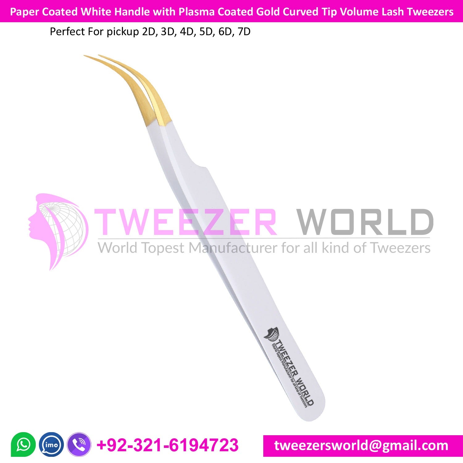 Product Name: Paper Coated White Handle with Plasma Coated Gold Curved Tip Volume Lash Tweezers